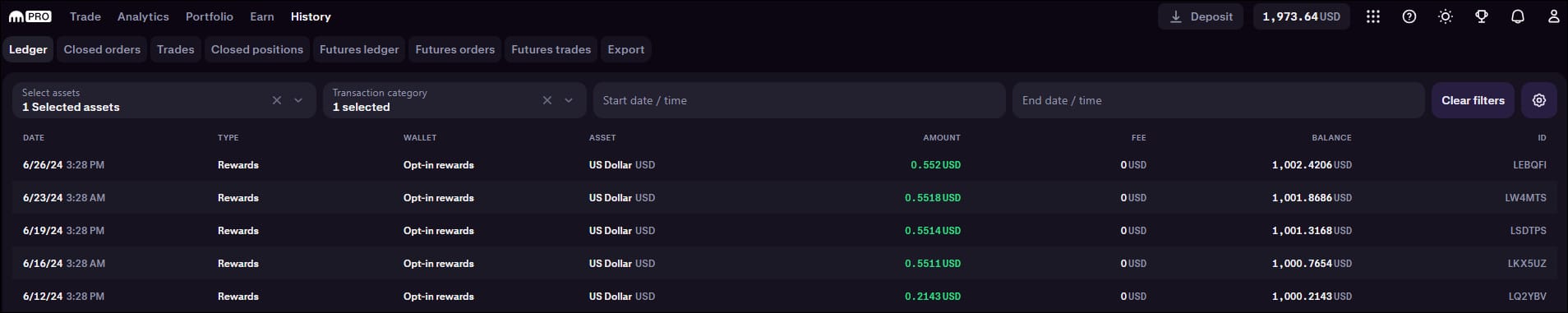 Kraken erstellt keinen Steuer-Report, stellt aber eine Transaktionsliste zur Verfügung, in welcher die Zinsgutschriften aufgeführt werden. Zudem ist ersichtlich, wie viel Zinsen auf der Plattform verdient wurden (über die gesamte Zeit, nicht pro Kalenderjahr)